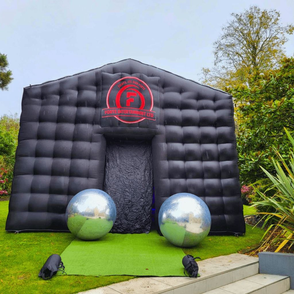 Our standard inflatable nightclub is 8m x 6m and comfortably holds 50-80 guests. We also have larger options for up to 150 guests. We'll recommend the right size based on your guest numbers.